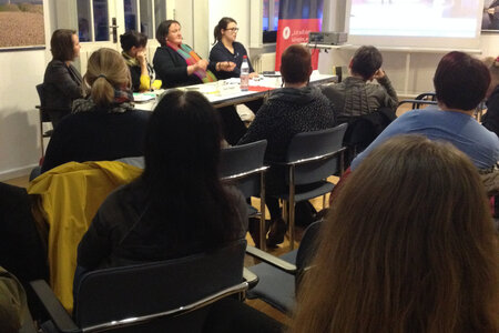 In der anschließenden Diskussion wurden Lösungsvorschläge laut, die sehr von angeblichen Unterschieden zwischen DEN Frauen und DEN Männern ausgingen, etwa dass Frauen weniger zurückhaltend sein müssten, wenn sie besser bezahlt werden wollten und höhere Positionen anstrebten. Nach Meinung der Referentinnen, aber auch von Frauen im Publikum, geht es in der männlich bestimmten Arbeitswelt weniger darum, gewissenhaft seine Arbeit zu machen, sondern mehr darum, auf sich aufmerksam zu machen und die richtigen Kontakte zu knüpfen. Das fällt Frauen offenbar schwerer als Männern, da Frauen nach wie vor überwiegend eher zurückhaltend seien und ihre Arbeit taten, ohne ihre Leistung an die große Glocke zu hängen. Außerdem müssten sie oftmals Arbeit und Familie miteinander vereinbaren, könnten sich abends also nicht mit Kollegen treffen und netzwerken, da sie sich zu Hause um die Kinder und den Haushalt kümmern müssten oder sich ehrenamtlich engagierten.