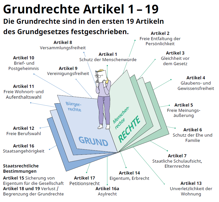 Grundrechte sind grundlegende Rechte, die Menschen gegenüber dem Staat haben. In Deutschland sind sie im Grundgesetz in den Artikeln 1 bis 19 festgelegt.