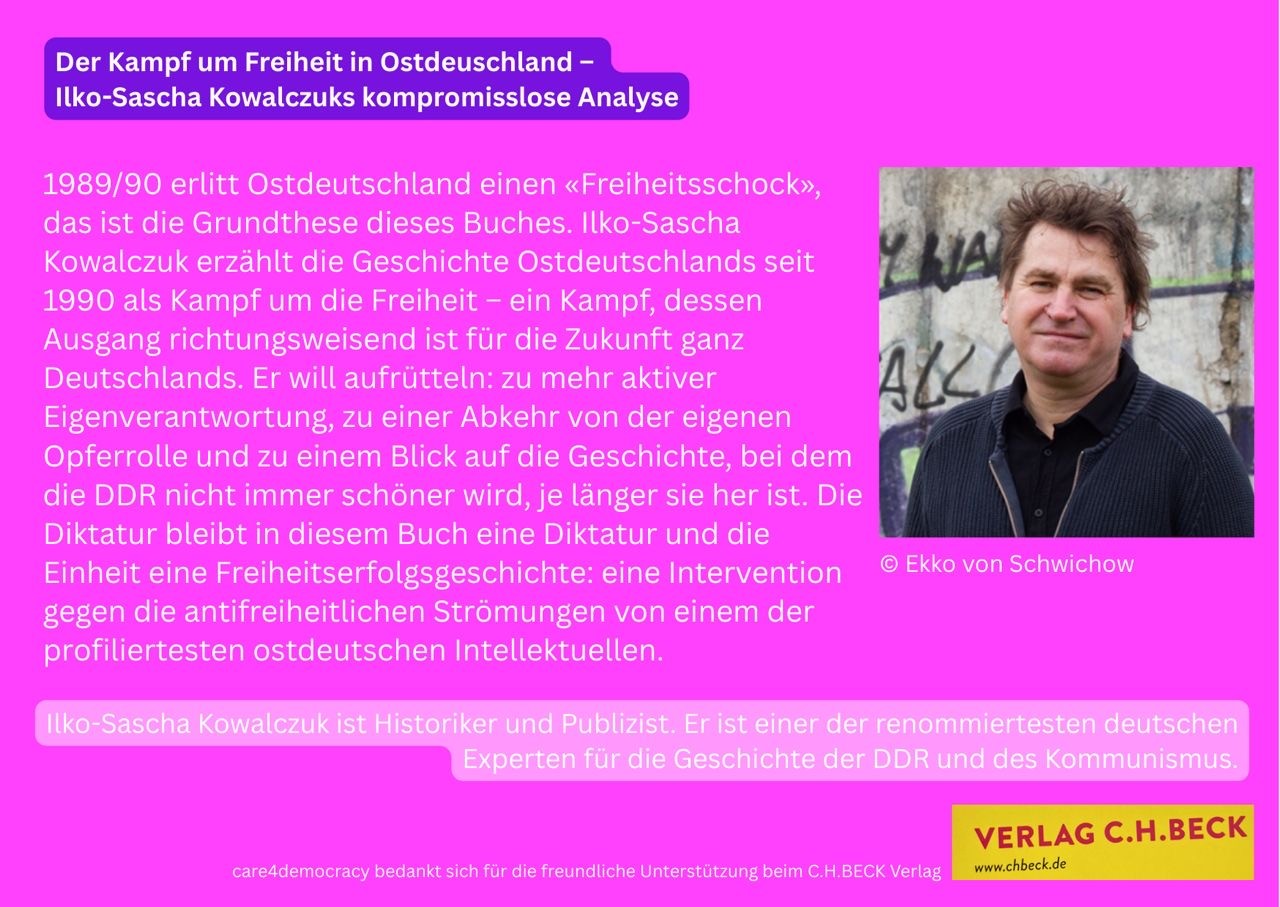 "Wieso wird die liberale Demokratie gerade dort in Frage gestellt, wo die erste erfolgreiche Revolution auf deutschem Boden stattfand? Über Ostdeutschland wird gerade intensiv diskutiert, und Ilko Sascha Kowalczuk ist eine der markantesten Stimmen dieser Debatte."