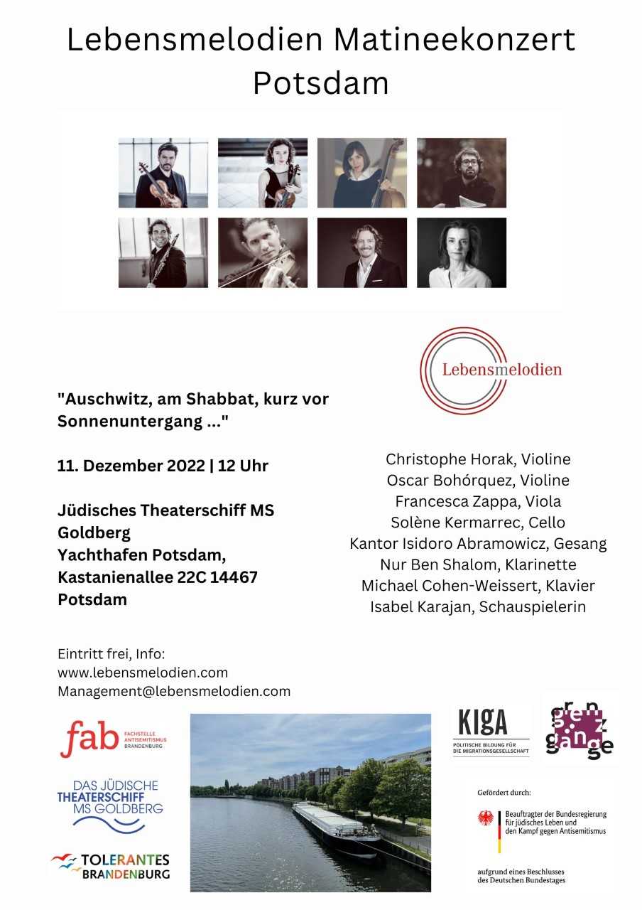 Am Sonntag, den 11.12.2022, findet auf dem Jüdischen Theaterschiff MS Goldberg um 12:00 Uhr das dritte Konzert des Bildungsprogramms „Lebensmelodien“ statt, eine Kooperationsveranstaltung mit der Fachstelle Antisemitismus Brandenburg. Es handelt sich hierbei um ein neues, jüngst uraufgeführtes Programm, welches in dieser Form in Brandenburg noch nicht gespielt wurde.